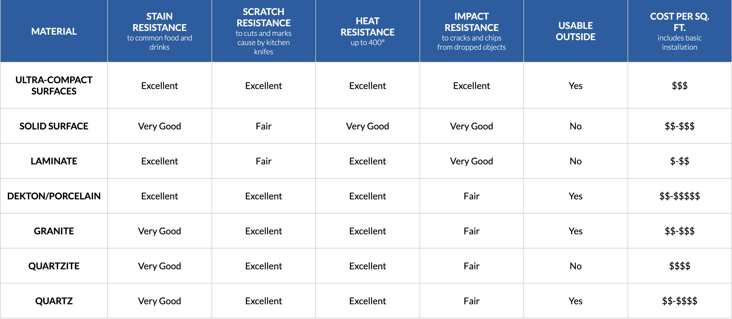 Need help deciding? See the Compare Countertop Materials chart to see the benefits of each option before making your choice.
